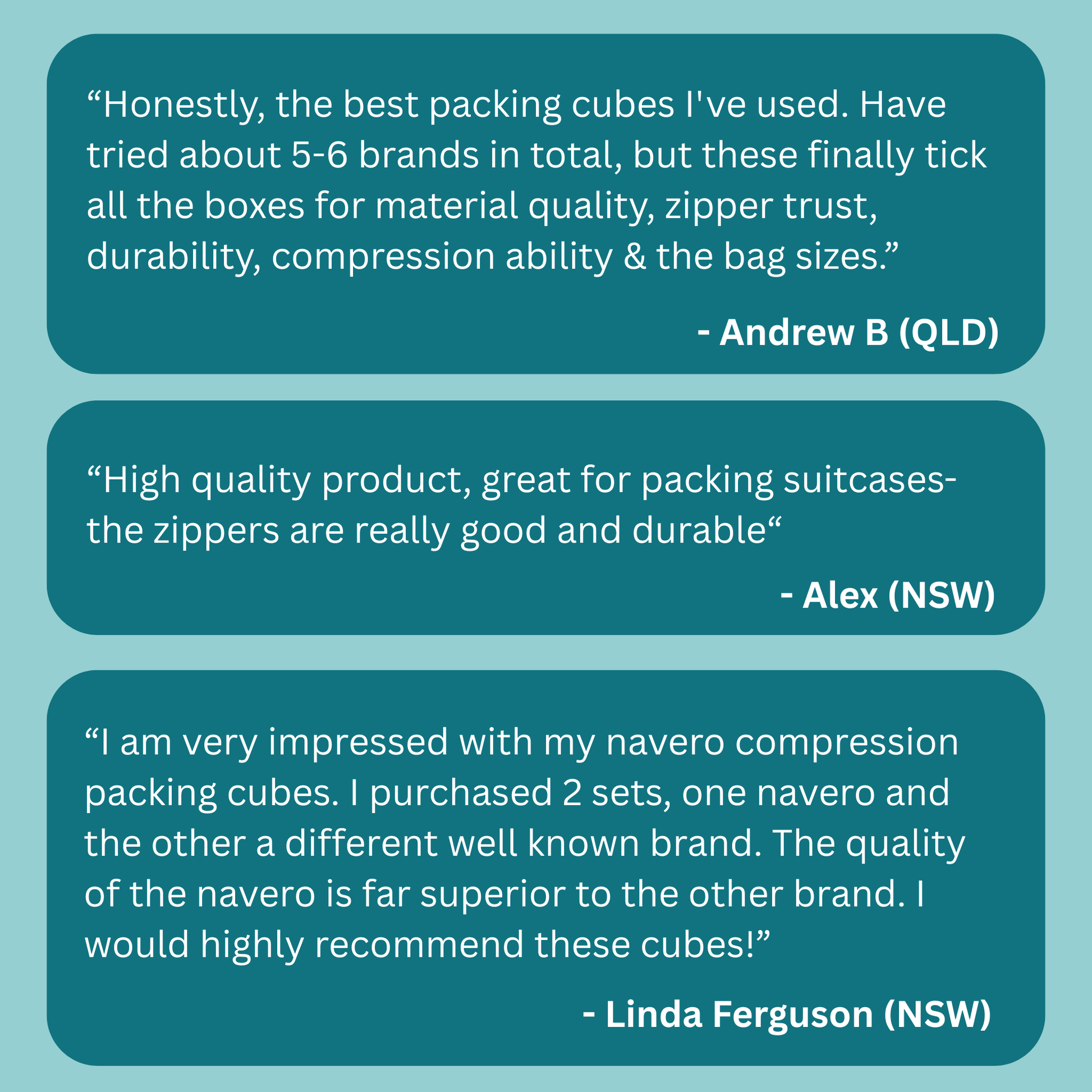 I am very impressed with my navero compression packing cubes. I purchased 2 sets, one navero and the other a different well known brand. The quality of the navero is far superior to the other brand. I would highly recommend these cubes!
