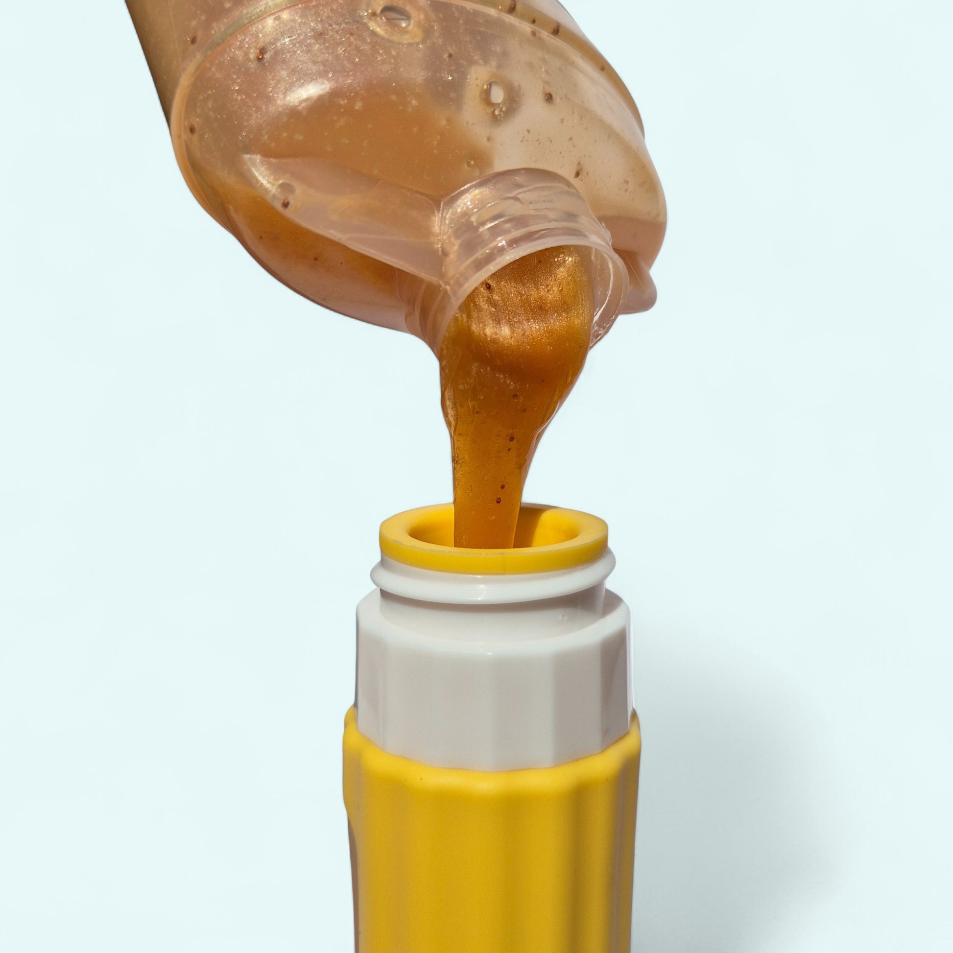 To fill, unscrew the clear plastic lid. Once filled, always hold upright when unscrewing or the contents will spill out.